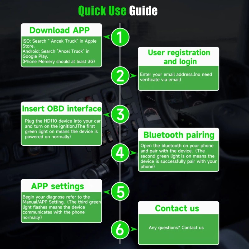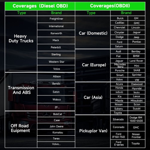 This Bluetooth diagnostic device support diesel OBD full system diagnostics for diesel trucks/pickups, including Engine, ABS, Transmission, Tire Pressure, Body Controller, Instrument Cluster, Brakes, Communication Unit, Aftertreatment, SART Module, etc. As long as your truck complies with the agreement, you can diagnose the system and cover a wide range of models.
