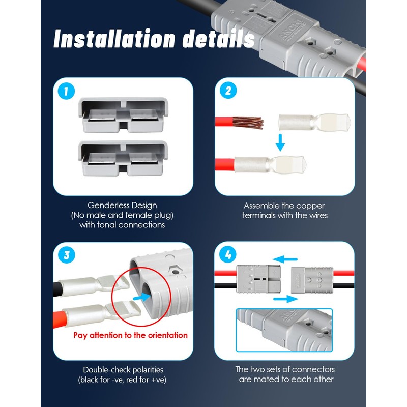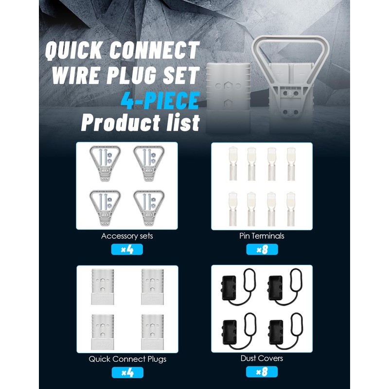- 4 x 350Amp 2-pole Housing Battery Connector plugs (Interconnecting halves),8x Copper terminals Silver plated,4 x Handle,4 x Cover Dust.