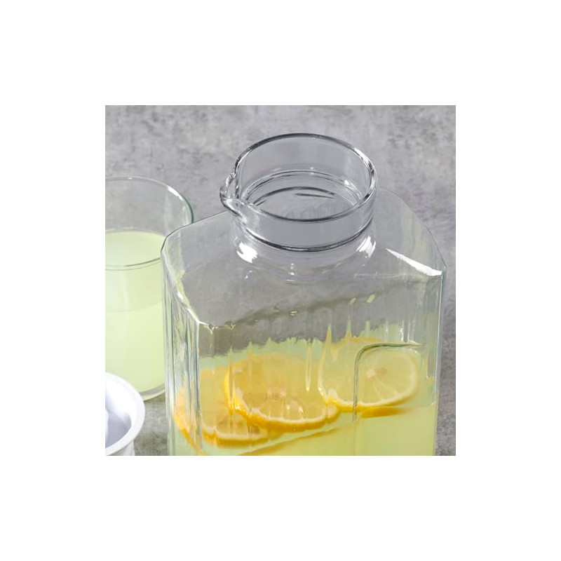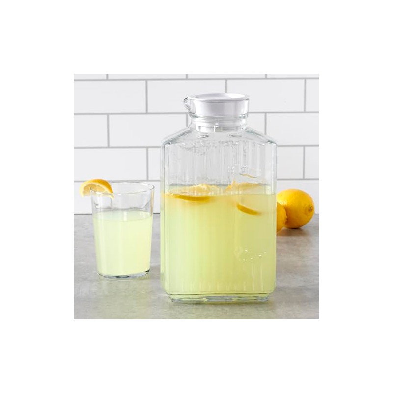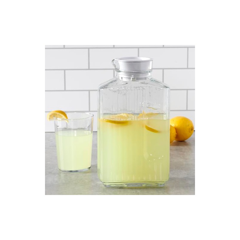 This Anchor Hocking Glass Bistro Pitcher Set is perfect for your fine dining and everyday meals. It provides an elegant, distinctive element that will enhance drink presentation at your dining room table or backyard cookouts. This pitcher is ideal for serving beverages like water, iced tea, or lemonade. The Glass Pitcher includes a lid/ stopper to prevent any accidental spills at the table or during transport. This pitcher also boasts a crystal clear glass construction, making it the perfect vessel for delivering vibrant, colorful drinks. For an extra special presentation, add fresh fruit or mint as an attractive garnish or flavor enhancer. The paneled, angular design adds a textured look to your tabletop while allowing for a good grip during use. Thanks to its ample size, this pitcher ensures an elegant presentation while still being efficient and easy to use.