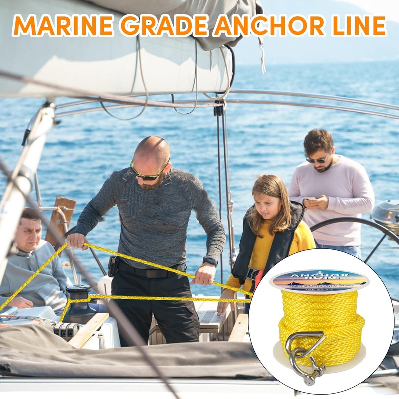 - 【MARINE GRADE ANCHOR LINE】Anchor rope is made of braided polypropylene that is low stretch,superior strength and flexibility.Anchor line rope resist saltwater, gas, oil, acids, abrasion and UV.Our boat anchor line soft and can limit scratch to boat surface.Solid braid rope can effectively absorb shocks or shaking movement caused by mooring, towing,ensuring ultimate stability and safety for your vessel in challenging weather conditions and under extreme pulling forces.