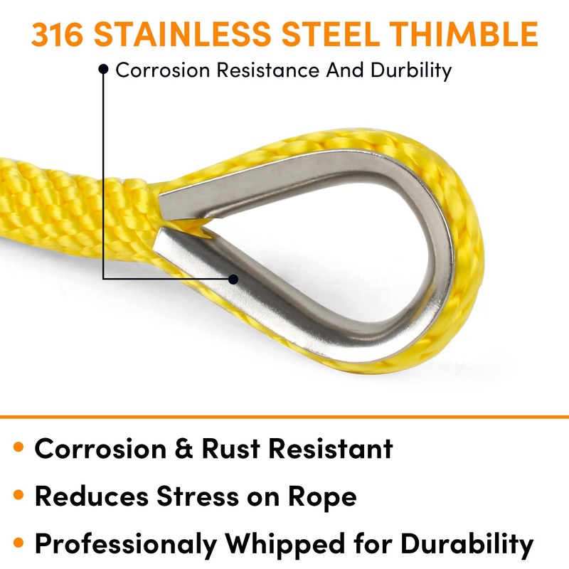 - 【STAINLESS STEEL THIMBLE & SHACKLE】Anchor rope 50 ft equipped with a stainless steel thimble and shackle,the stainless steel thimble on one end of the boat rope anchor will reduces chafe and spreads the load on the line,its high resistance to abrasion make it a reliable and long-lasting choice.You can easily fix and remove anchors,chains etc, it brings convenience to marine use. The anchor line for boat on the other end is heat sealed to prevent it from falling apart, and makes it easy to grip.