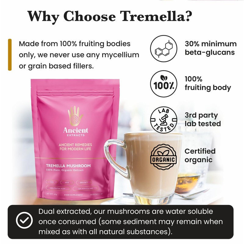 - 30% Beta Glucans Promotes Better Digestion C Tremellas natural fiber and 30% beta glucans support gut health and promote healthy digestion, creating a balanced environment for better nutrient absorption and overall wellness.