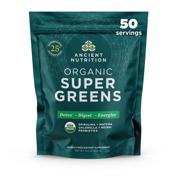 Ancient Nutrition Super Greens Powder, Organic Superfood Powder with Probiotics Made with Spirulina, Chlorella, Matcha, and Digestive Enzymes, 50 Servings, 14.1 oz
