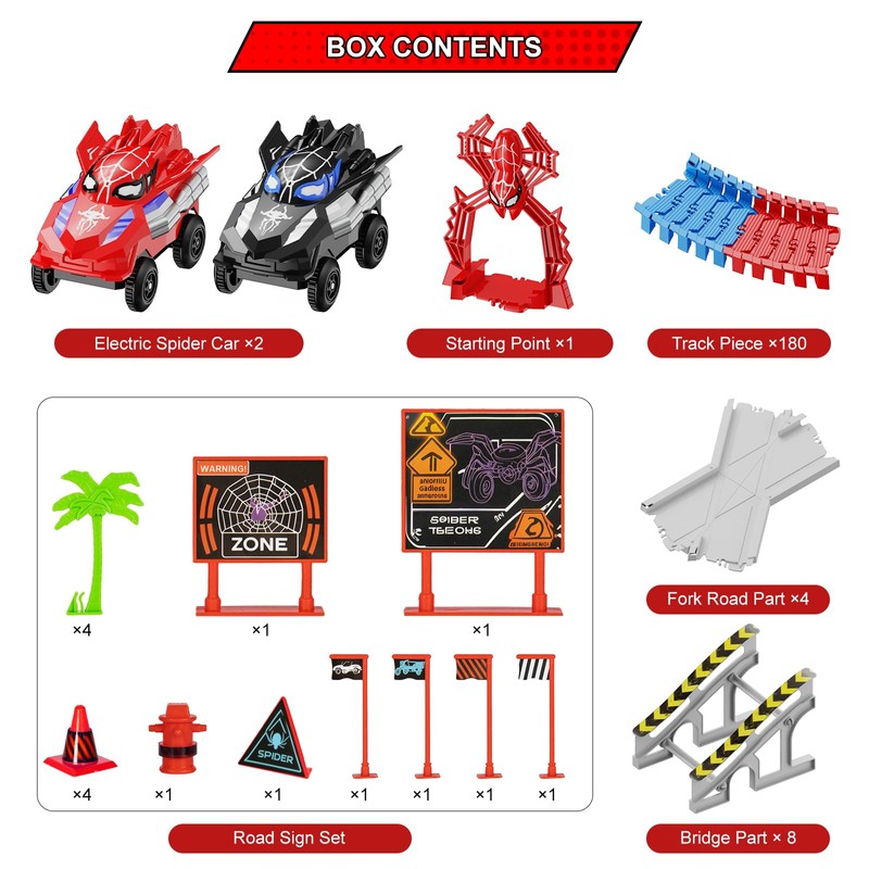 - Spider-Themed Adventure Track: Dive into exciting adventures with this 212 pcs spider race track set! Featuring 2 unique electric spider cars and a twisty, bendable track system, kids can build their very own racing world full of imaginative fun (2 AA battery required, Not included)