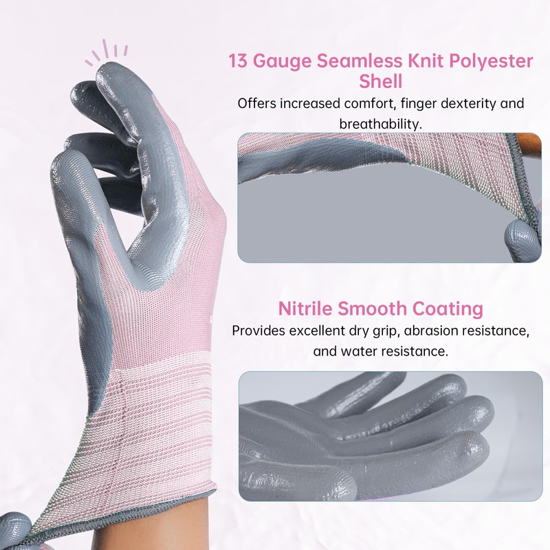 ANDANDA 12 Pairs Work Gloves, Smart Touch, 23D Comfort Stretch Fit, Nitrile Coated Work Gloves with Grip, Seamless Knit Nylon Work Gloves Men Suitable for General Work,Pink(L)