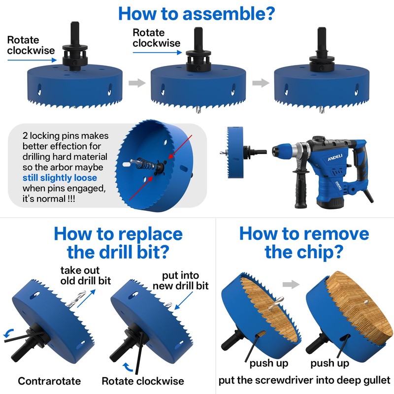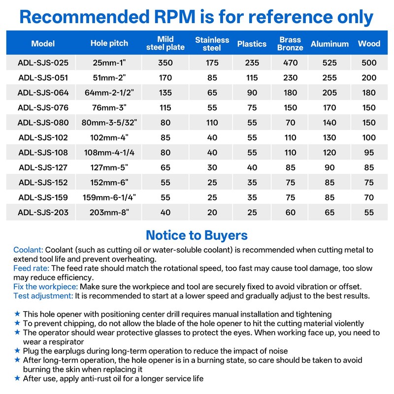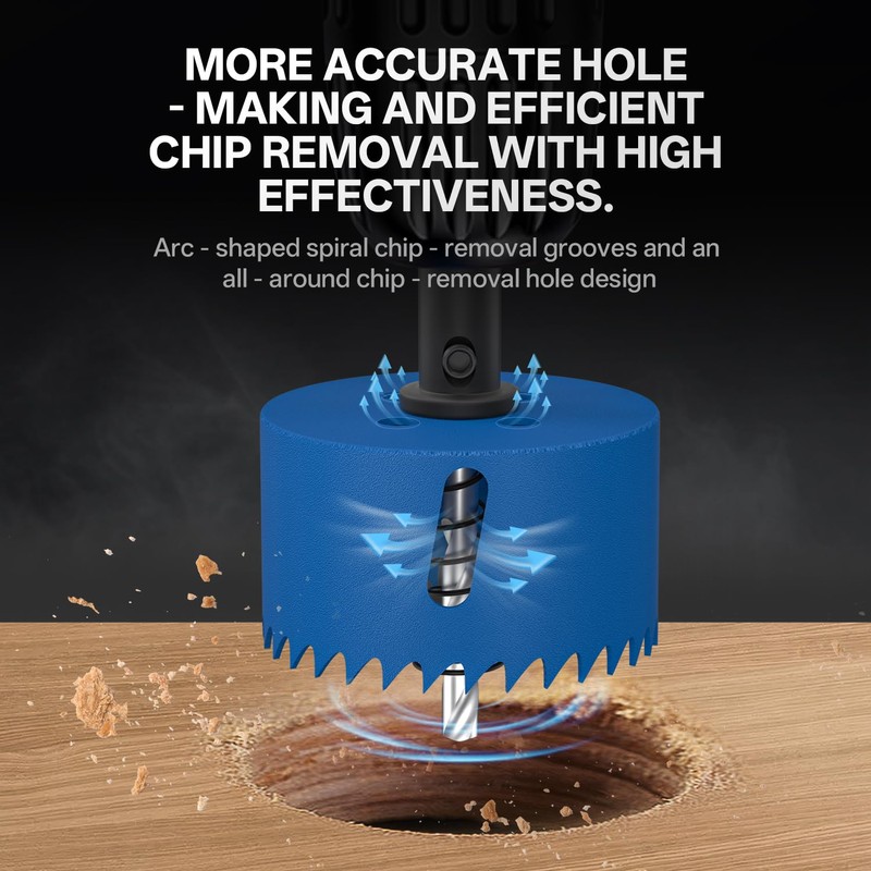 - [Precautions for use]: Start the hole saw cutting with a low-speed rotation. When cutting wood, pull the power tool up and down to facilitate chip evacuation. It is best to use coolant when cutting metal materials to prolong the life of the hole opener. When using a bimetal hole saw, wear protective gear such as goggles and a mask.