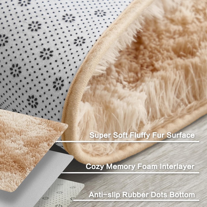 1. The fluffy faux fur is made of premium microfiber material, adding durable stitching and binding technology that keeps the fur shaggy long time and not easy to shed. Use a tight technical weaving process to make sure the edges are less likely to fall apart. After long-term continuous research, the anti-slip particles have high-quality anti-slip performance, which can hold the floor more firmly.