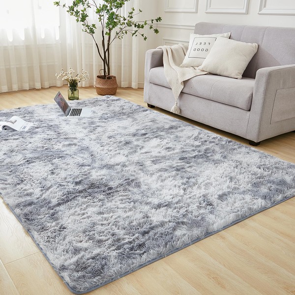 Andency 8x10 Shag Area Rug for Living Room, Tie-Dyed Light Grey Soft Fuzzy Plush Indoor Carpets for Bedroom, Non Skid Fluffy Faux Fur Rug for Room