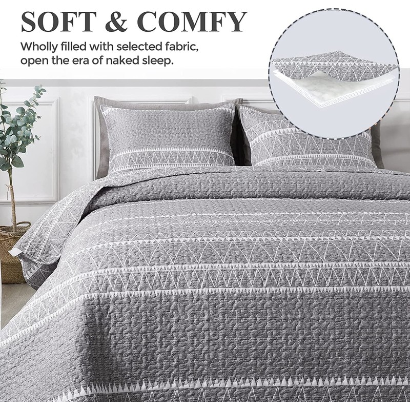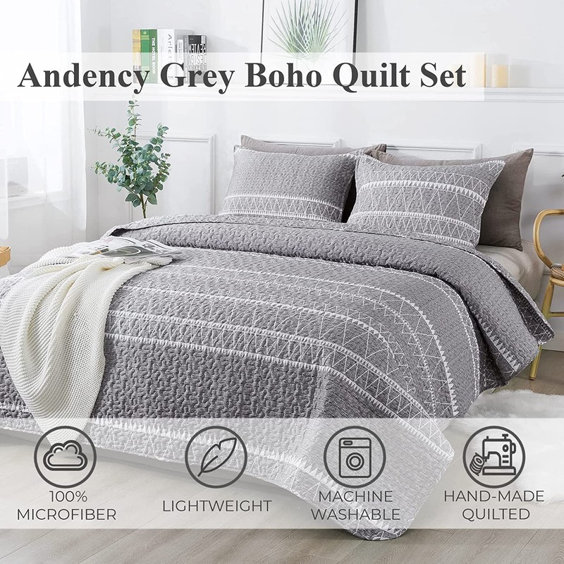 Andency is a brand specialized in researching and developing bedding products, aim to provide you comfortable and high-quality bedding sets and enhance your sleeping experience. Why Choosing Andency Bohemian Quilt Set Soft Feeling - microfiber filling : 100% premium quality microfiber is considered to be a super-soft filling, which makes the entire quilt set more comfy and breathable. Minimalist Style - perfect indoor match : Classic boho style with striped triangle pattern will work well with both traditional and modern minimalist decor and will freshen up your bedroom. Also, it's a great gift idea for your family and friends, making it easy for you to keep up with your lifestyle! Comfy Fabric-Wonderful experience: While ensuring a soft touch, the material is light and airy. The Boho quilt set is wrinkle-stain, and fade-resistant, which is durable and all-season usable. Delicately quilted stitching-Durable in use: Better geometric stitching and weaving also ensure it no ripping or tearing for longtime use. Matching Pillow Cases: Our grey quilt set comes complete with a quilt and two matching pillowcases. Add artistic beauty to the bedroom and make the room decor tasteful. Suitable for all season: This quilted coverlet set consists of 3 separate layers carefully stitched together to create lightweight, perfect coverlet quilt sets are warm and cuddly in winter and cool in summer. Enhance your room style: The quilt set is designed with classic Bohemian style with striped triangle, the classic pattern is easy to match your bedroom, guest room, children's room, holiday house, dormitory decor, offering you an elegant and classic feeling.