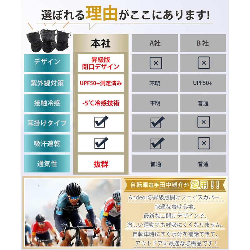Andeor (Used by Cyclist Athletes) Face Cover, Neck Guard, For Summer, New Opening Design, Contact-5°C Cooling Technology, Neck Warmer, Ear Hanging, Easy to Breathe, Black