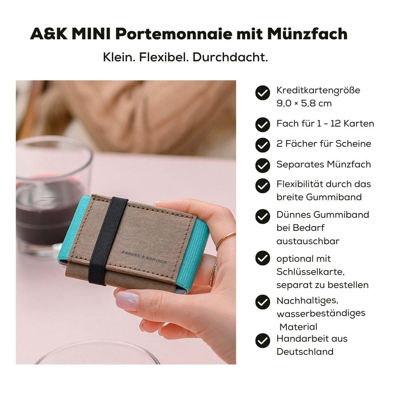 - 5 REASONS FOR THE A&K MINI: 1. Super light, 18 g - 2. Adapts to the content: space for 1-12 cards, coins and notes - 3. Ideal for on the go: whether holidays, parties, festivals, concerts or simply as a daily wallet - 4. Always suitable: street style in jeans, in a dress, in the clutch, the jacket pocket or in a suit, the A&K MINI always fits - 5. A gift in plastic-free packaging - for men and women.