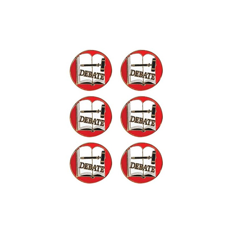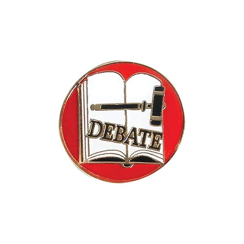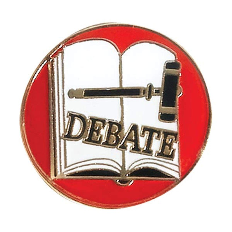 - Gold metal award lapel pin measures approximately 1" and features a white book, a black gavel and the word Debate in black and outlined in gold against a bright red background