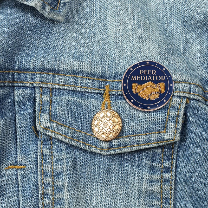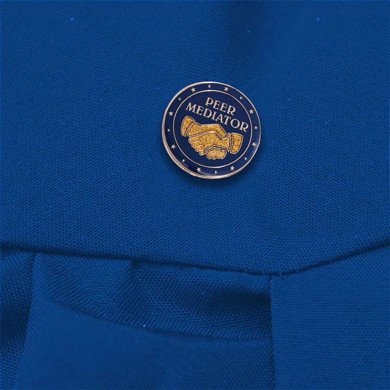 - This Gold Glitter Peer Mediator Leadership Pin Pack includes (25) 1" diameter Leadership Award Pins with a gold glitter handshake design on a blue background with a gold star design around the perimeter