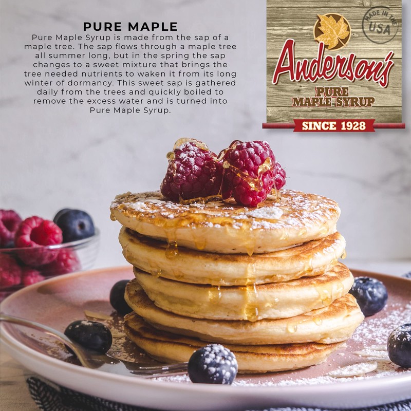 - Anderson’s has been making great tasting maple syrup since 1928. We source our maple syrup from small independent family farms that share our commitment to quality, environmental stewardship, and sustainable forest management. We support and love working with family farms. We currently work with over 100 different family farms. As a family run business we prioritize family in everything we do.