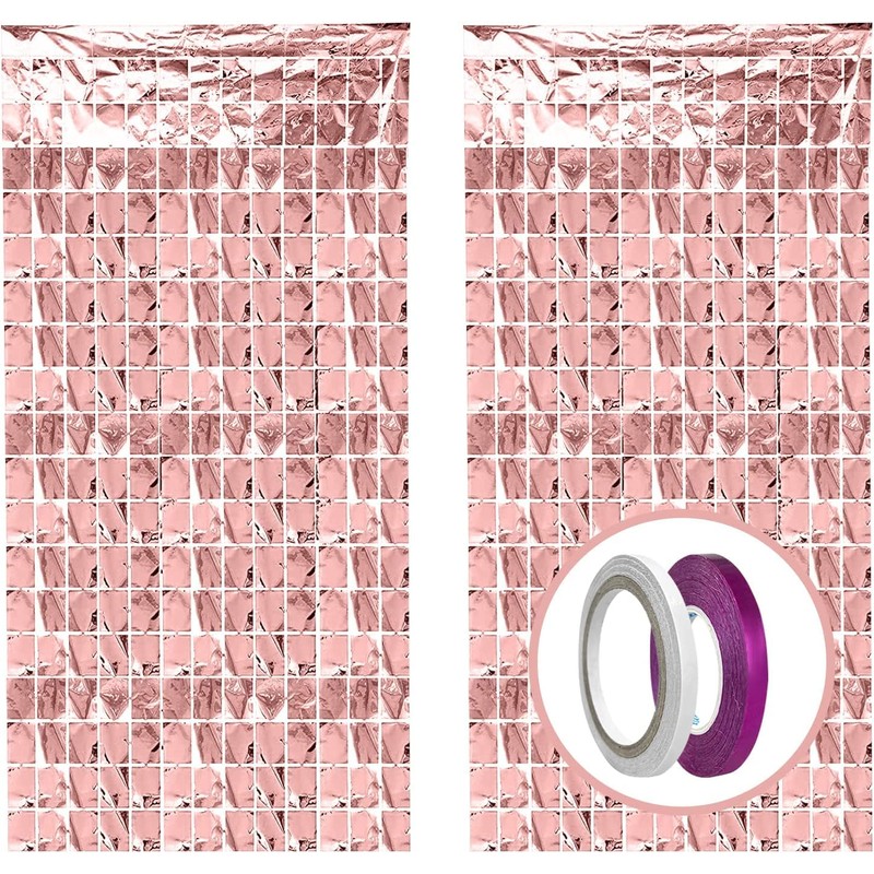 Andiker 4Pcs Silver Party Curtain Sets, 2 Square Foil Curtain Backdrop with 1 Roll of Ribbon and 1 Spare Tape Gorgeous Metallic Fringe Backdrop Curtains Large Curtains for Party Decoration (Rose)
