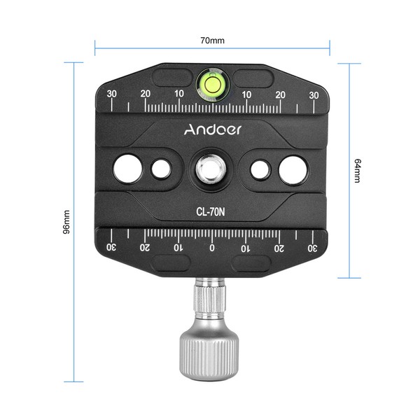 Andoer CL-70N 70mm Aluminum Alloy Quick Release QR Plate Clamp 3/8-inch with 1/4-inch Adapter & Bubble Level for Arca Swiss Benro Acratech Kirk Wimberley Gitzo Manfrotto RRS QR Plate