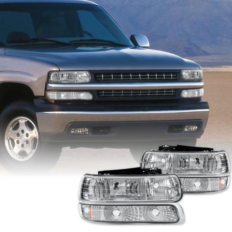 ANDPLAY Headlight Assembly Headlamp,Compatible with 1999 2000 2001 2002 Chevy Silverado/ 2000-2006 Suburban Tahoe bumper Headlamp,Clear lens Chrome Housing Amber Reflector