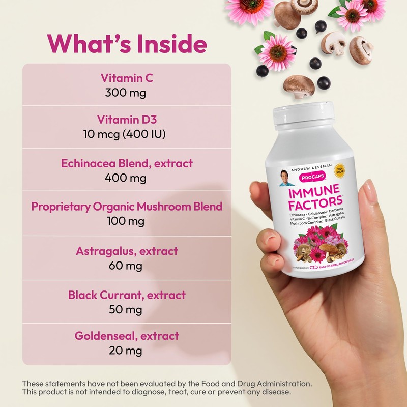 ANDREW LESSMAN ANDREW LESSMAN Immune Factors 60 Capsules – Echinacea, Goldenseal, Vitamin C, Astragalus, Berberine, Mushroom Blend, Black Currant. Supports and Promotes Immune System and Natural Defenses