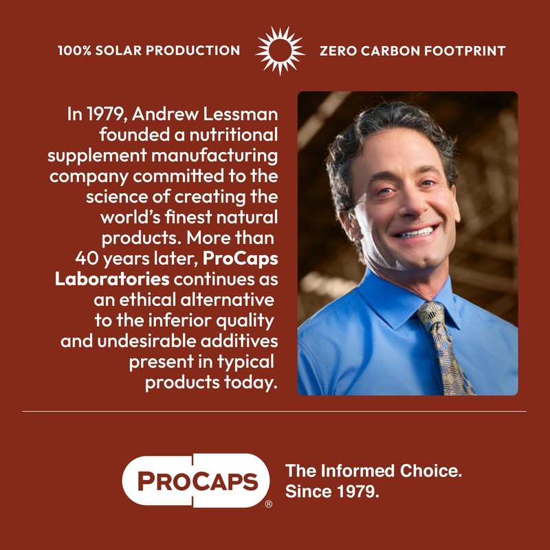 • ETHICAL & ECO-FRIENDLY. ZERO CARBON FOOTPRINT – Uniquely committed to your health and the health of the planet, ProCaps’ facilities are 100% Solar Powered with a Zero Carbon Footprint and an LEED GOLD green building status. ALL ProCaps bottles are made from 100% recyclable post-consumer resin. Plus, Andrew Lessman and ProCaps are the largest donor of prenatal vitamins in the world (over 1.5 billion capsules donated to date). ProCaps, the Informed Choice for Nutritional Supplements.