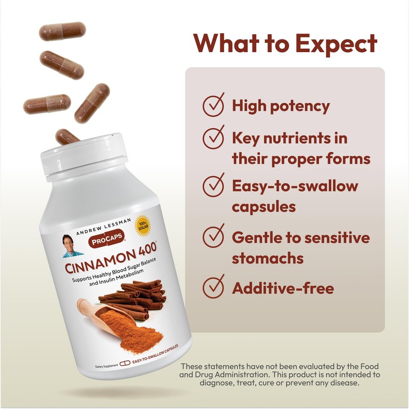 ANDREW LESSMAN’S Cinnamon 400 offers a unique concentrated blend of standardized extracts of Cinnamon Bark delivering the powerful protective compounds naturally present in this respected spice. For centuries, Cinnamon has been sought after, not only for its distinctive flavor, but also for its health-promoting properties. In fact, Cinnamon remains one of the oldest herbal remedies used in traditional Chinese medicine. Our Cinnamon 400 delivers a comprehensive standardized blend of polyphenols from three unique Cinnamon extracts. As with all plant-based supplements, there is more to making a quality Cinnamon product than placing some ordinary, powdered Cinnamon into a pill. To receive the benefits of Cinnamon, one must always seek standardized extracts of Cinnamon Bark delivering beneficial levels of their key protective compounds. Our unique, concentrated blend of these distinct standardized extracts of Cinnamon Bark assures the most comprehensive protection from this remarkable natural ingredient.