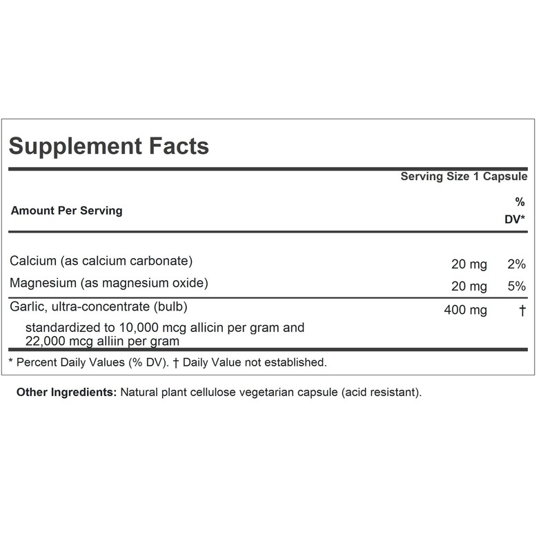 - SUPERIOR 100% PURE BIO-ACTIVE INGREDIENTS – Provides 400 mg of ultra-concentrate garlic extract, standardized to 10,000 mcg allicin per gram and 22,000 mcg alliin per gram. Also: calcium and Magnesium. Contains NO Milk / Dairy-Free, Gluten-Free; NO soy, yeast, corn, wheat, sodium, salt, sugar, fat, cholesterol, color, preservative, common allergens or manufacturing additives.