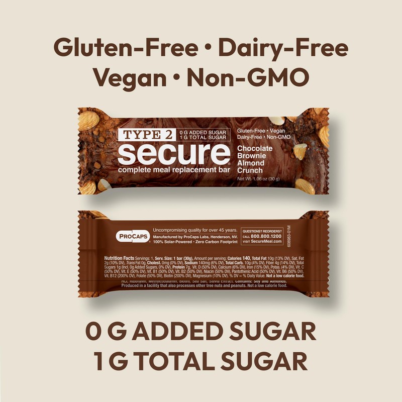 - Unmatched Taste, Texture, and Nutrition. Nothing comes close to TYPE 2 SECURE in taste, texture, and nutrition. Each bar provides a satisfying meal or snack with 7 grams of protein, 50% to 200% of the Recommended Daily Intake (RDI) of 11 vitamins, 0 grams of added sugar, and only 1 gram of total sugar.