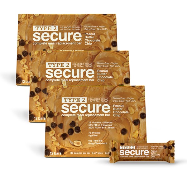 ANDREW LESSMAN Type 2 Secure Complete Meal Replacement Bars – Peanut Butter Chocolate Chip – 36 ct box – 7g Protein, 0g Added Sugar, 1g Total Sugar, 16 Essential Vitamins & Minerals, Gluten-Free, Dairy-Free, Vegan, Non-GMO