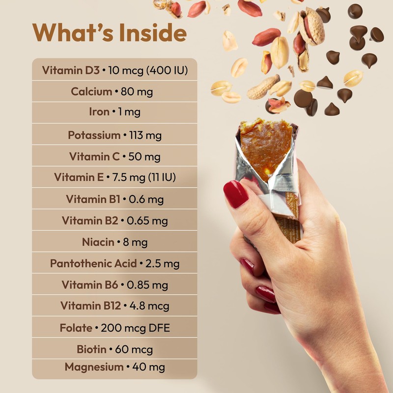 - Nutrient-Dense. Each bar contains only 140 calories, with 7 grams of protein, 50% of the RDI for9 vitamins, 200% of the RDI for B12 and biotin, along with 4 grams of prebiotic fiber to support a healthy microbiome.