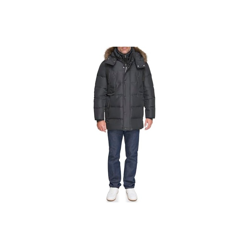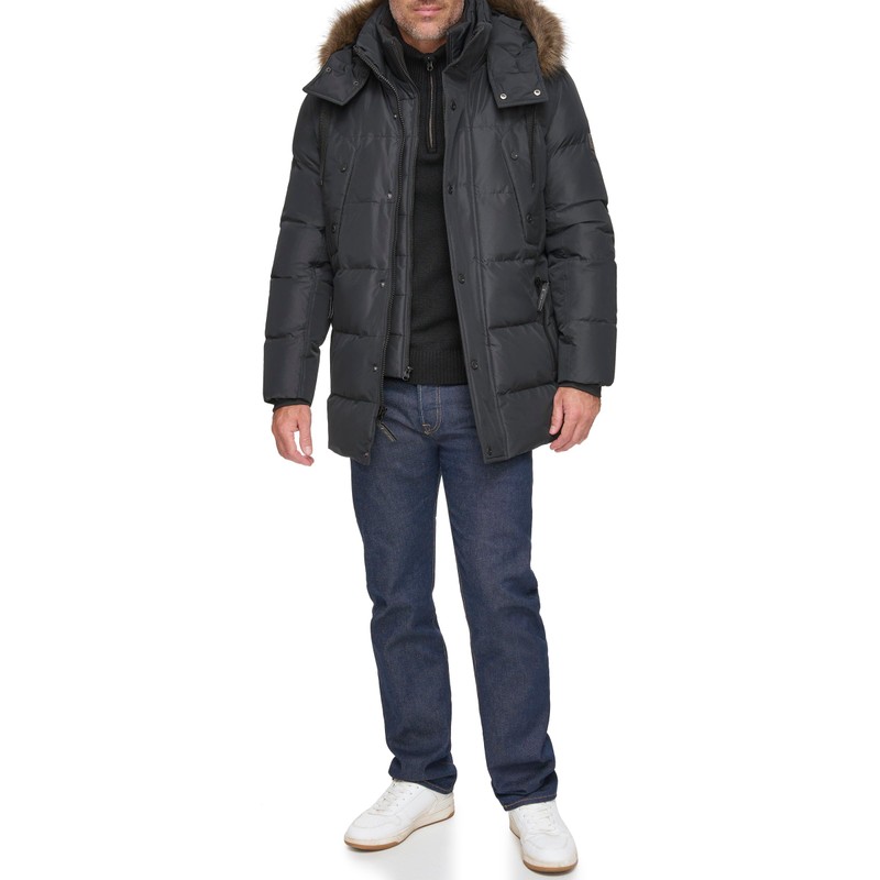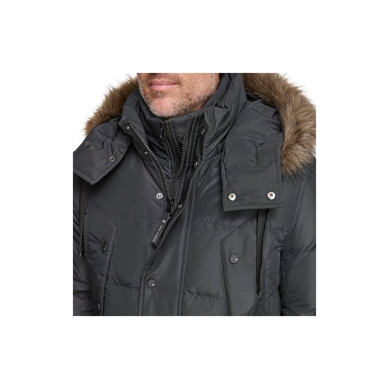 Andrew Marc Men's Gattica Down Parka Jacket with Removable Faux Fur Trimmed Hood and Bib, Black, Medium