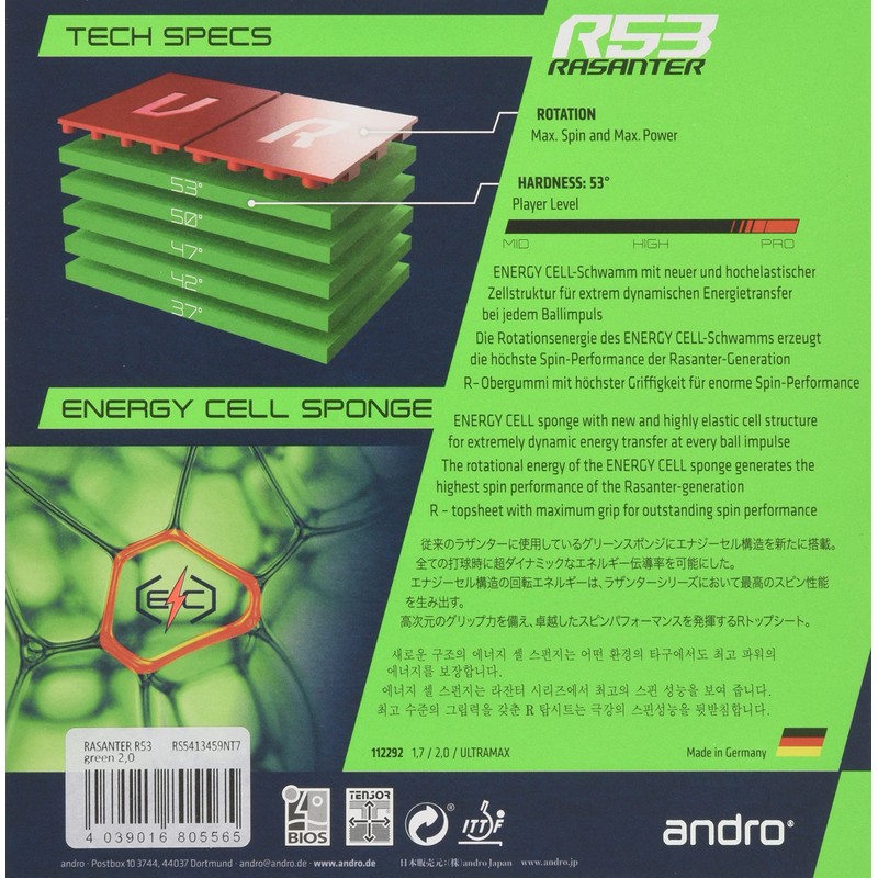 andro Ultra 110021092 Table Tennis Rubber Razantar R53 Soft Back UM Tension, Green
