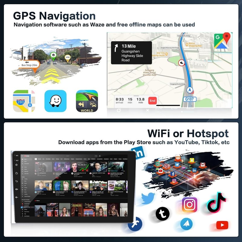 - 【GPS Navigation & HD Backup Camera】Dual navigation system that supports offline and online maps. you can download free worldwide maps in Herewego to get the latest road conditions. Come with HD backup camera, displays HD image when parking. (Note: We have equipped this car stereo with the latest HD rearview camera, it may not be compatible with some models, if the camera does not work, please contact us, we will send you a replacement camera for free)