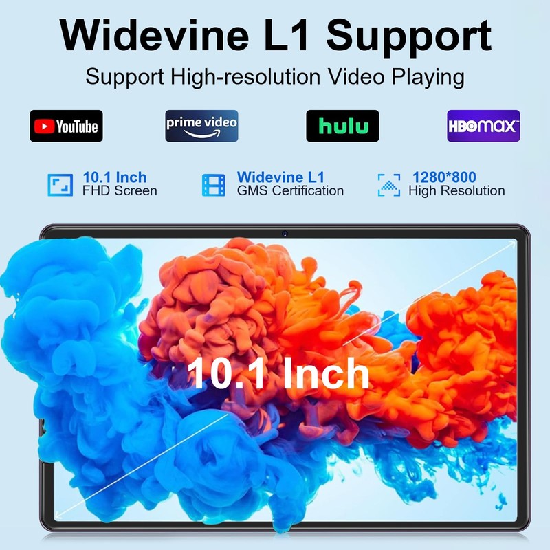 • 【Widevine L1 & 10.1 IPS Incell Screen】IPS Incell Screen delivers sharper screen and high quality images. 1080P video playback and support Widevine L1, you can enjoy a high quality video playback experience with Hulu、Amazon Prime Video、Disney+、YouTube,more apps. The 8 MP rear camera and 5 MP front camera allow you to capture life’s moments in stunning detail, while the dual speakers deliver clear, immersive sound, perfect for movies, music, and video calls.