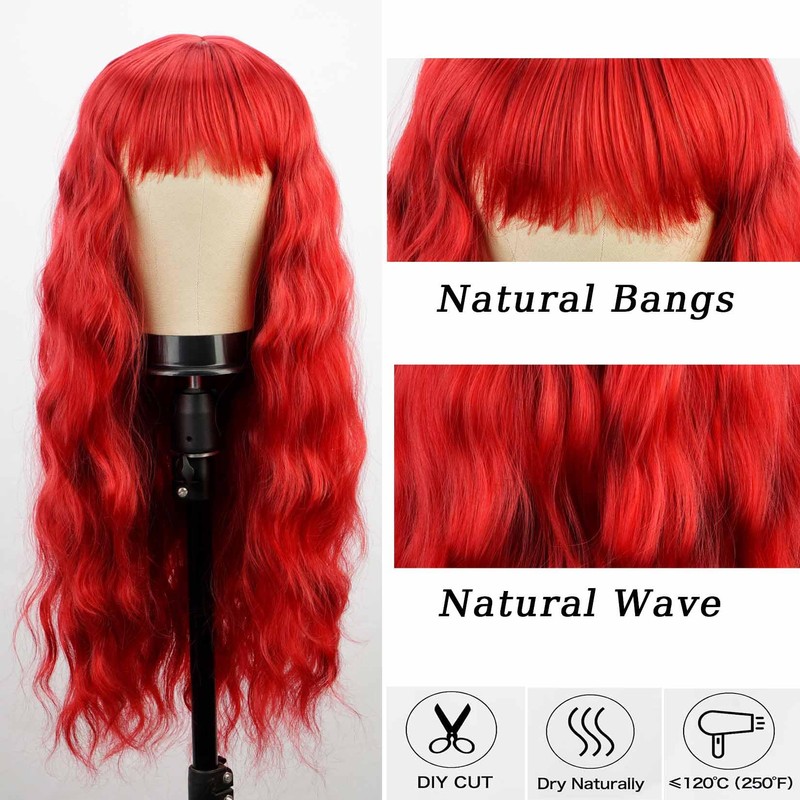 Wig style:Red long wavy wig with bangs. Bangs can be trimmed to different lengths .