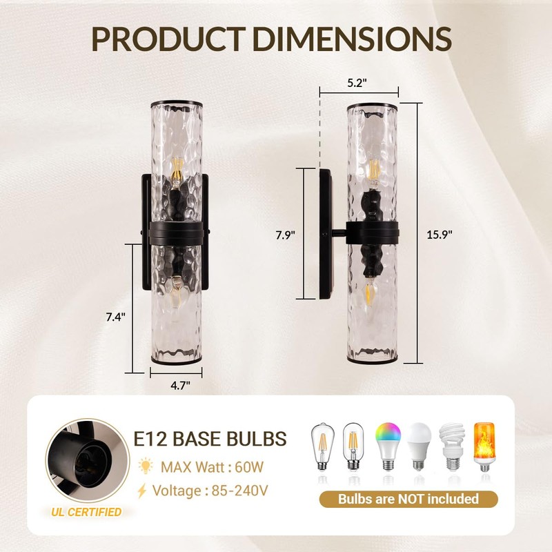 • E12 Base & Safe Use: Designed with safety in mind, our tight bathroom light features UL-certified wires and sockets for reliable; E12 base bulbs(max 60W), compatible with Edison, incandescent, CFL, and LED bulbs; Note: Bulb & switch are not included