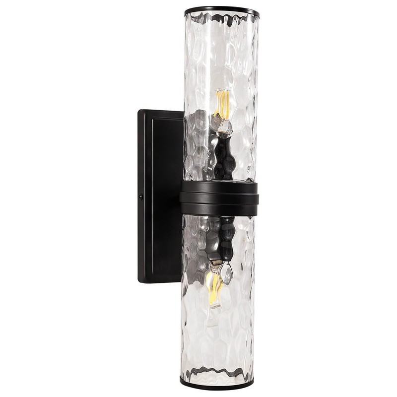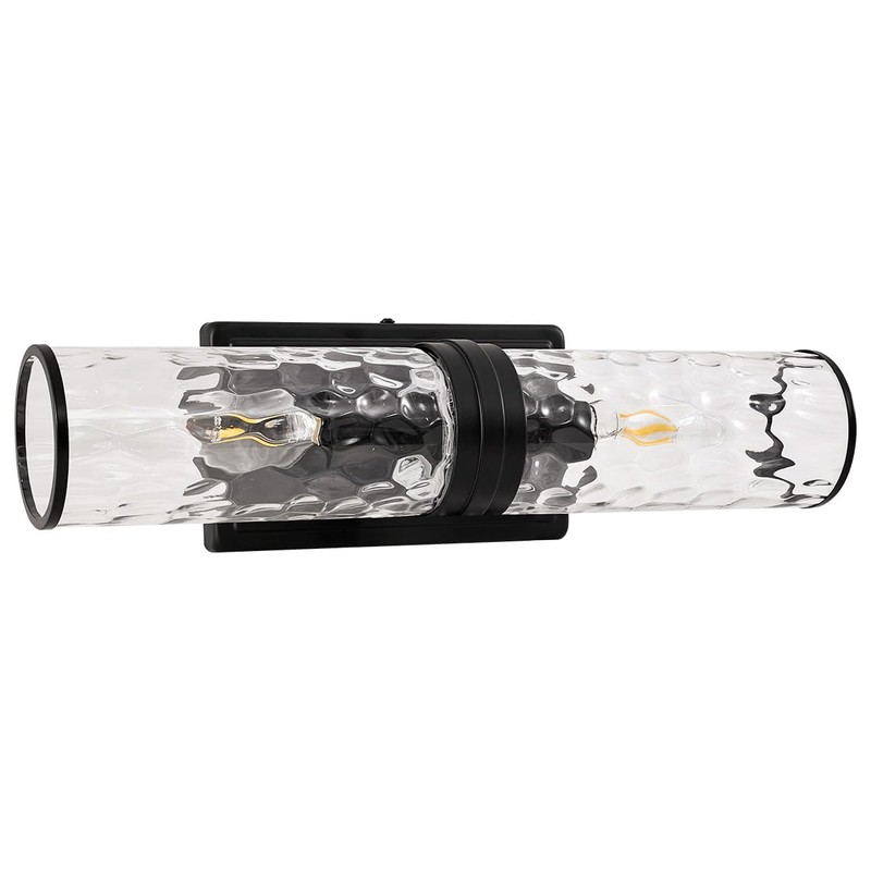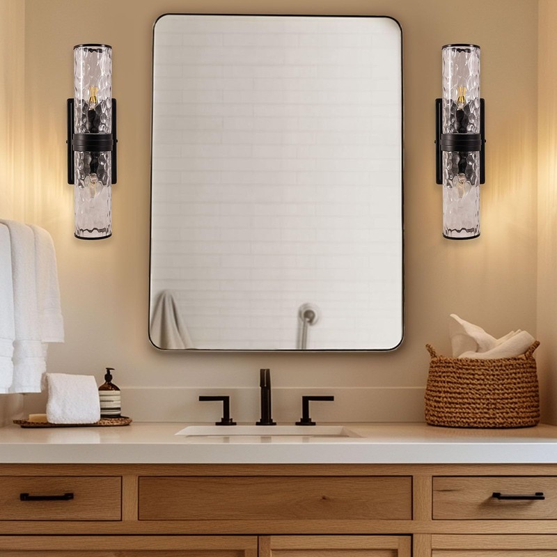ANDY STAR Bathroom Light Fixtures, 2-Light Black Vanity Wall Sconces Light with Water Ripple Cylinder Glass Lampshade, Hammered Vanity Light Over Mirror for Stairwell Living Room Bedside, E12