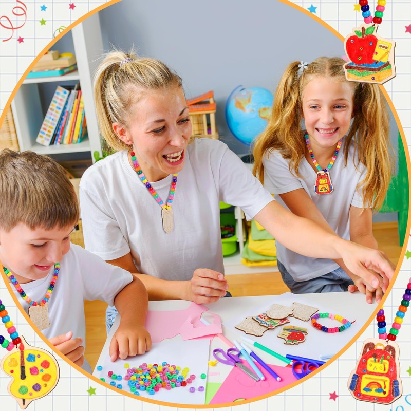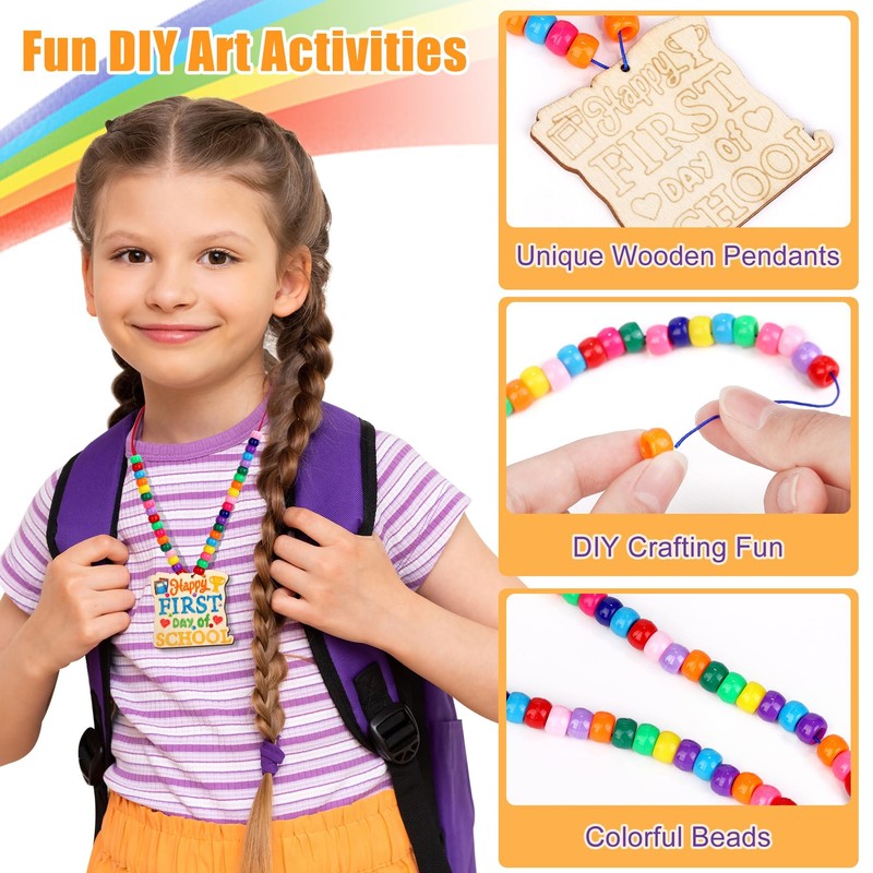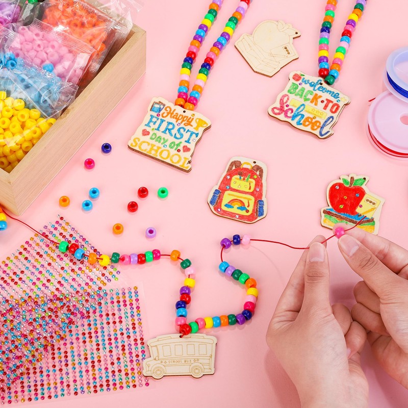 - Back to School Necklace Kit: features 24 wooden pendants (8 unique designs, 3 of each), 12 bags of vibrant beads (200 beads per color in 12 shades), 2 rolls of durable threads (10m each in red and navy), and 2 sheets of shimmering crystal stickers; this comprehensive 40-piece set includes everything needed for 24 students to design their own back to school bead necklace