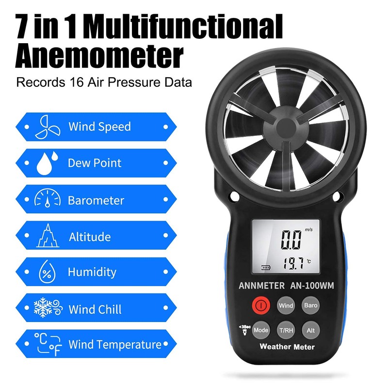 ✔Multifunctional-Combing various functions in one, AN-100WM works as anemometer, wind chill indicator, barometer, altitude measurement tool, dew point detector, relative humidity monitor.