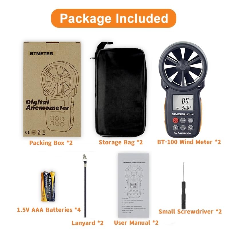 Anemometer Handheld - BTMETER BT-100 Wind Speed Anemometer Air Flow Meter Accurately Measure Wind Temperature Speed CFM for Shooting, HVAC, Drone Flying (2 PACK)