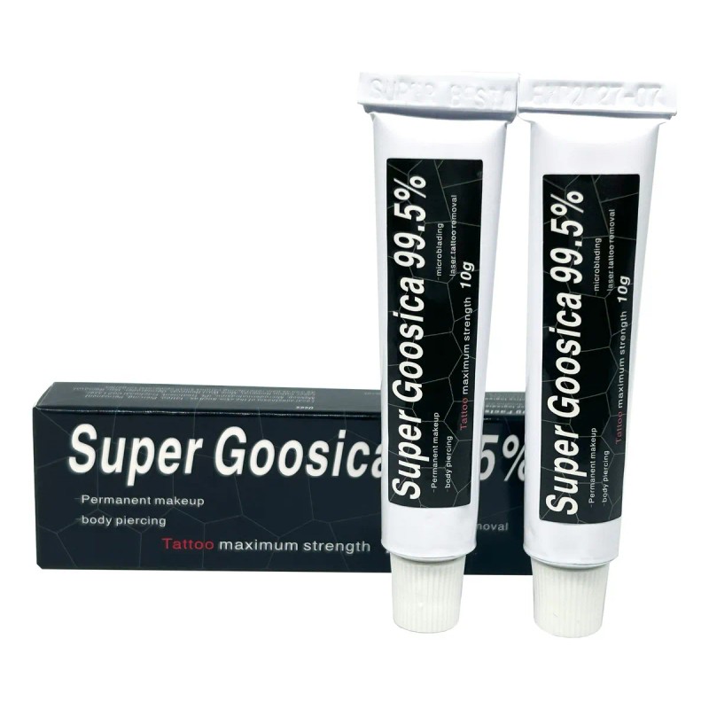 Super Goosica® 99.5% es crema previa de la más alta calidad y máxima potencia, para eliminar el dolor asociado con tatuajes, eliminación de tatuajes, microblading, tratamientos de radiofrecuencia fraccionada, Dr. Pen, Dermapen, Láser CO2, BBGlow, Piercings y más.