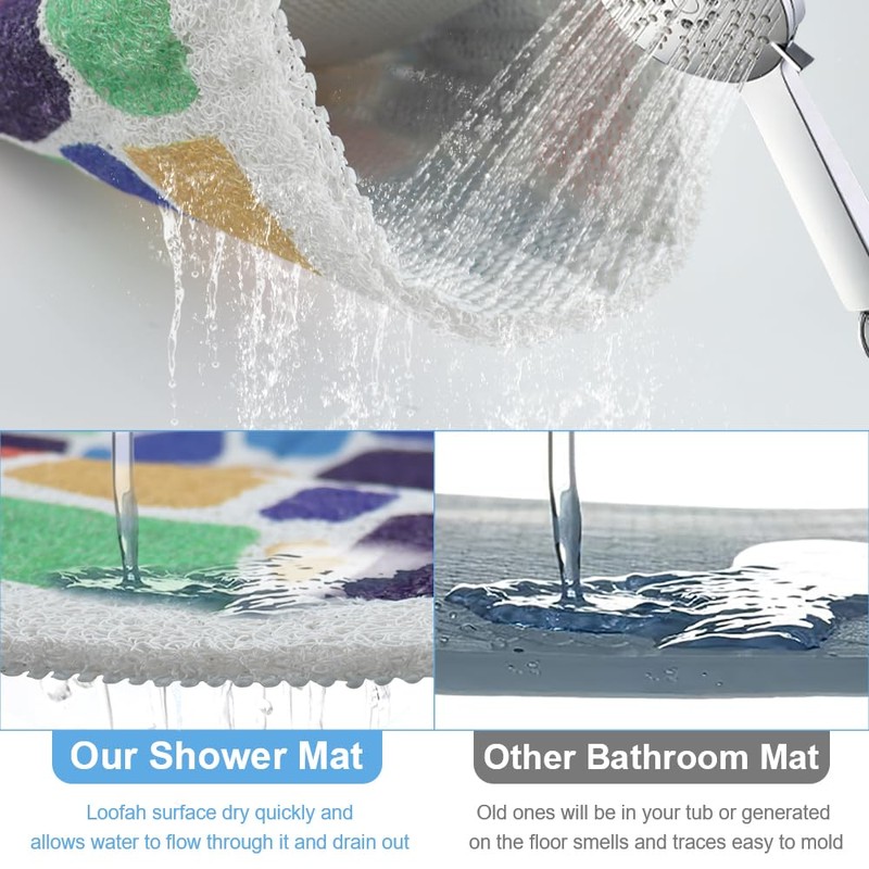- SUPERIOR DRAINAGE Natural drainage holes, a looped surface and a grid layer work together to flow water through the non-slip bathtub mat without clogging. Place loofah shower mat directly over the drain and the water will flow directly through the mat.