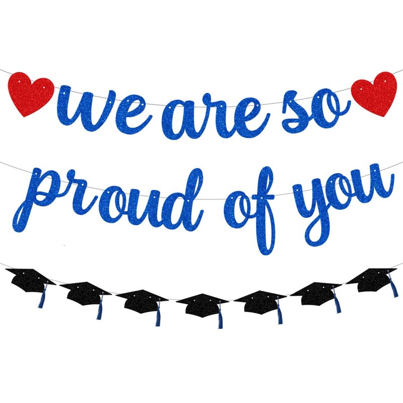 • We Are So Proud of You pull flag is crafted from quality cardstock, with glitter letter, good for American graduation seasons. Whether it's a sunny commencement on the lawn or a breezy backyard party, the flag remains beautiful for background decoration, making it as a good gift of this special occasion