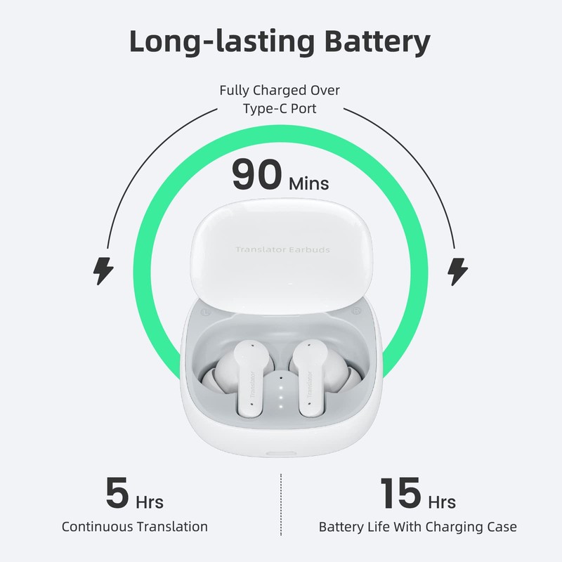 - Enjoy uninterrupted communication with Anfier's translator earbuds, boasting up to 15 hours of battery life with the charging case. Translate for up to 5 hours continuously, ideal for long trips or extended use. Experience seamless communication all day long.