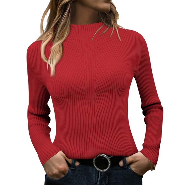ANFTFH Sweaters for Women Winter Warm Turtleneck Long Sleeve Sweaters Knit Tops Red L