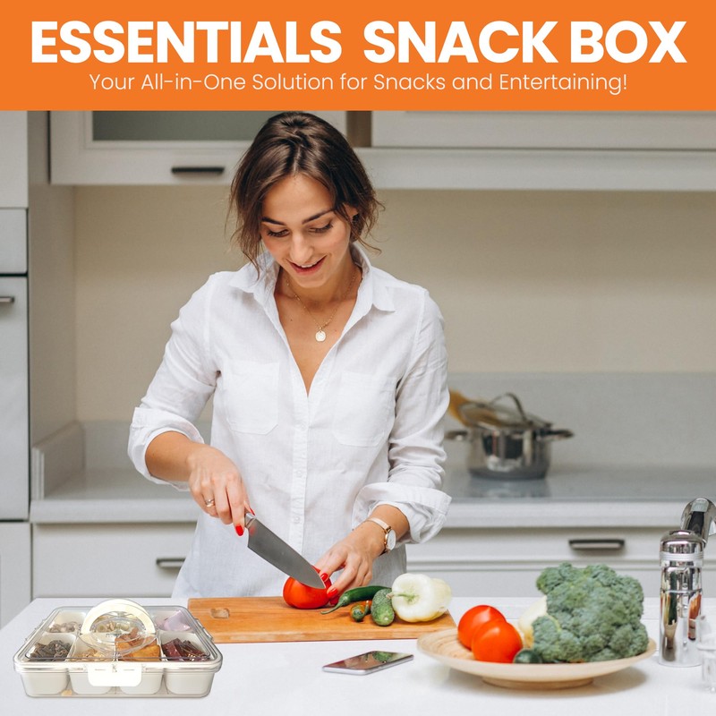 - 🧰ULTIMATE PORTABLE SNACKLE BOX: his cleverly designed tray features a secure lid and an easy-carry handle, making it perfect for beach days, road trips, picnics, and outdoor adventures. Whether you’re fueling up during sports events, or prepping meals for the week, this divided tray keeps your snacks fresh and organized.
