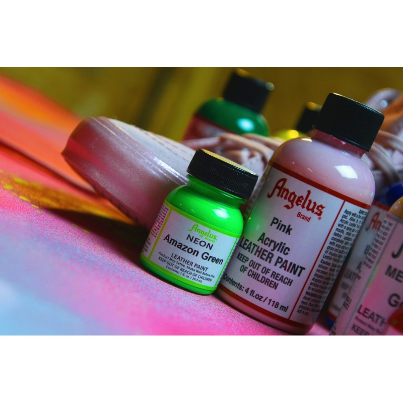 Apply with a fine brush or sponge. Allow to dry between layers. Spray gun or an airbrush gun can also be used for best results, make sure acrylic is clean before use. Clean up with soap and warm water. For added shine and protection against abrasion, a coat from Angelus acrylic finisher. Satin acrylic finisher or neutral leather colour after dry.