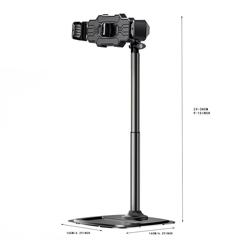 Angle Height Adjustable Phone Holder for Desk (9-15") Aluminum Alloy Desktop Cellphone Stand with Dual Mount System and Weighted Base 360° Rotation Retractable Cell Phone Holder for Recording Shooting