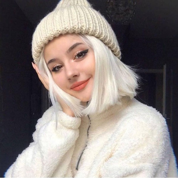 Angle Lucky White Bob Wig for Women Synthetic Lace Front Bob Wig Platinum Blonde Bob Glueless Wig Heat Resistant Fiber Soft Bob Wigs Daily Use 14''