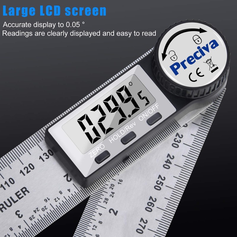 Angle Ruler, Preciva Digital Angle Finder Ruler Protractor, 400mm Length and Angle Measure with LCD Display, Stainless Steel Woodworking Angle Detector, Hold/Rev, Mm/Inch for Construction (Silver)