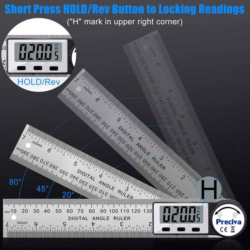 - [Hold/Rev Function] You can keep the data just by pressing the HOLD button; by pressing the Rev function button, you can flip the screen to read when measuring large angle, more easy and considerate; And laser engraving scale, clear and accurate, will not fall off