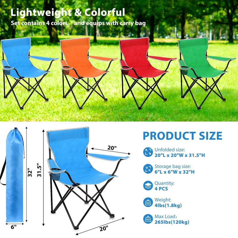 - You Will Get: 4 pieces of folding camping chairs with a size of approximately 20"L x 20"W x 31.5"H, capable of supporting up to 265 lbs of weight, soft and comfortable, suitable for adults; Each lightweight camping chair is equipped with a cupholder and carry bag; Bright colors bring you a good mood